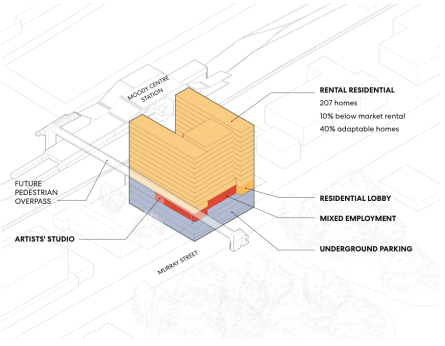 To get close to the 24 tower figure, Lurbiecki is probably using an expansive geographic definition and counting the entire potential Moody Centre TOD area. But the TOD concept is located entirely south of the CPR/SkyTrain right of way, with the preliminary vision featuring 12 high-rises and employment space spread throughout 20 acres – creating a complete community adjacent to Port Moody’s transit hub. It’s also been indefinitely stalled by the goalpost-changing incumbent council.